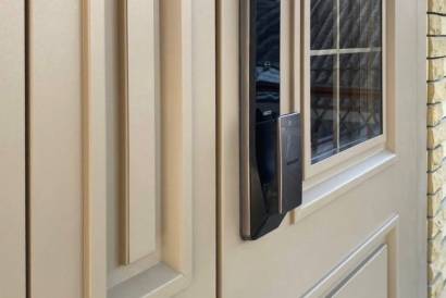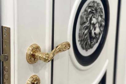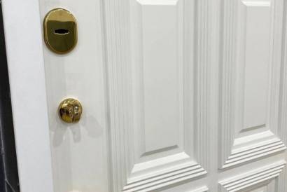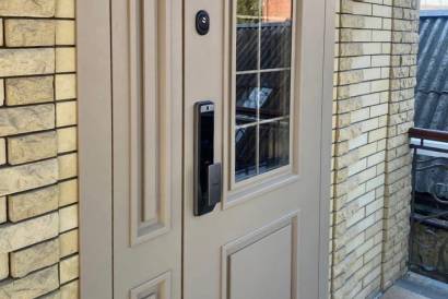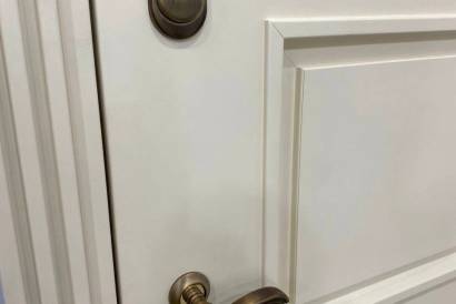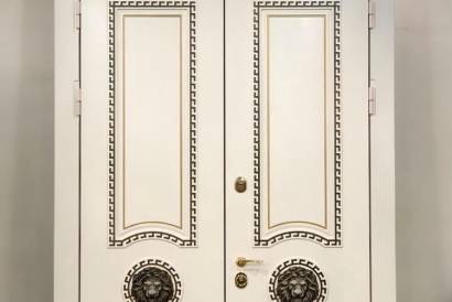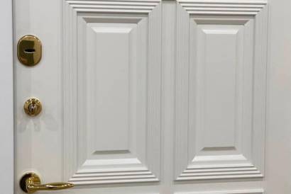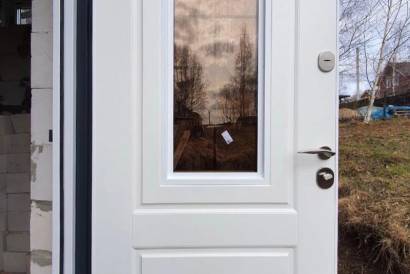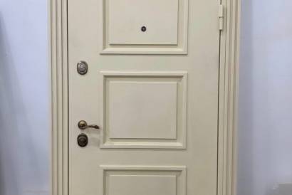 Светлая входная дверь, изготовленная по индивидуальным размерам, будет выигрышно выделяться из стандартных вариантов.