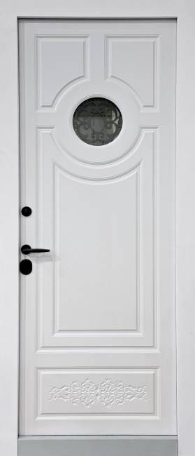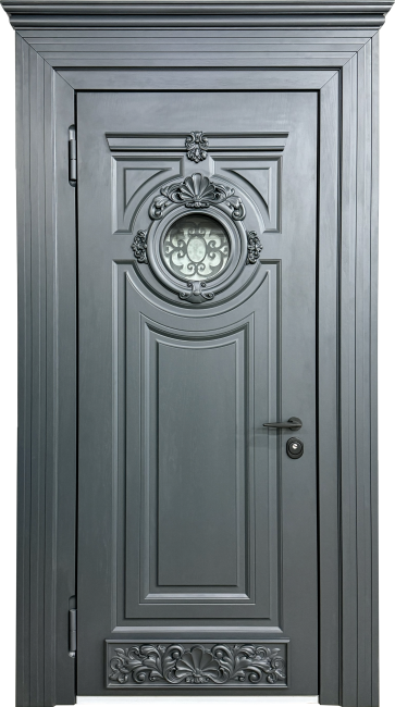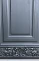 - Внешняя декоративная отделка из влагостойкой корабельной фанеры с натуральным шпоном, окрас эмалью по палитре RAL 7016, декоративные накладные элементы с рельефной резьбой из массива дуба напоминающий цветочные мотивы.