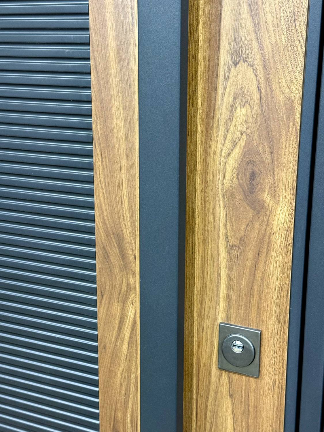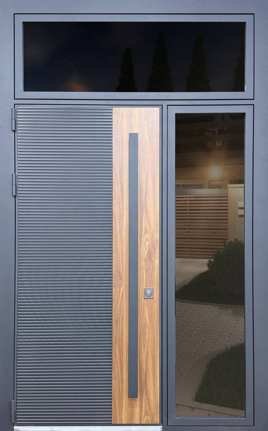 | Комплектация | - Внешняя отделка дверного полотна: декоративная комбинированная панель МДФ, покрытие грунт-эмаль RAL 7021 с горизонтальной фрезеровкой и вставка антивандального пластика HPL 1324 (Nutshell). - Внутренняя отделка дверного полотна: декоративная панель МДФ, покрытие грунт-эмаль RAL 9003 (белый). - Покраска дверного блока: внешняя и внутренняя сторона — порошковое напыление Муар 7021 + цинкование стали. - Уплотнение: три контура уплотнения, обеспечивающими герметичное прилегание дверного полотна к раме. - Заполнение полотна и дверного блока: многослойная теплоизоляция — фольгированный пенофол, минеральная вата и два слоя плотной минеральной плиты. - Терморазрыв: предусмотрен в конструкции дверного полотна и дверной рамы, предотвращает промерзание - Металлоконструкция: выполнена из холоднокатанной стали с нанесением порошкового цинкогрунта, обеспечивающего надёжную защиту от коррозии. - Боковая вставка и фрамуга: четырёхкамерными стеклопакетами с чёрной тонировкой в металлическом рамочном обрамлении с двух сторон. - Габариты дверного блока 2150х960 мм. - Изготовление: возможно выполнение двери по индивидуальным размерам заказчика. Дополнительно можно установить: - Доводчик скрытого монтажа NOTEDO. - Декоративный накладной порог из нержавеющей стали. |