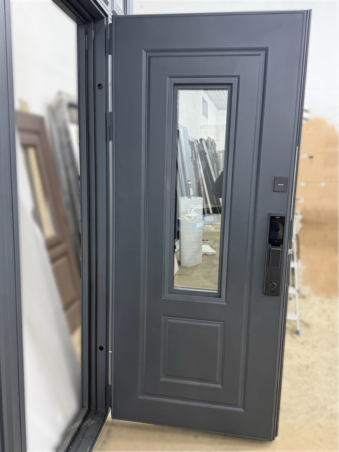 | Комплектация | Внешняя отделка: Металл с порошковым покрытием «Муар» (RAL 7016). Декор: Объёмные металлические филёнки, придающие двери классический и выразительный внешний вид. Внутренняя отделка: МДФ-панель под грунт-эмаль (RAL 7016) с широкой классической фрезеровкой. Уплотнение: Три контура уплотнения для герметичного прилегания полотна к раме и эффективной защиты от холодного воздуха и сквозняков. Заполнение полотна и коробки: Многослойная теплоизоляция (фольгированный пенофол, минеральная вата и два слоя плотной минеральной плиты) для максимальной защиты от холода и сохранения тепла внутри помещения. Терморазрыв: Конструкция полотна и рамы с терморазрывом эффективно предотвращает промерзание и минимизирует теплопотери. Металлоконструкция: Холоднокатаная сталь с порошковым цинкогрунтом для надёжной защиты от коррозии. Остекление: Трёхкамерные стеклопакеты с зеркальной тонировкой с внешней стороны. Изготовление: Возможность производства двери по индивидуальным размерам для точного соответствия проёму. Электронный замок Sanyo D500 Поддерживает 5 способов разблокировки: отпечаток пальца, PIN-код, RFID-карта, мобильное приложение и механический ключ Оснащён Wi-Fi модулем для подключения к мобильному устройству Встроенный видеодомофон с цветным монитором 4,5" Поддержка мобильного приложения Smart Life (Tuya) для удалённого управления и контроля доступа Питание от аккумулятора ёмкостью 4200 mAh До 3200 циклов открывания на одном заряде Обеспечивает высокий уровень безопасности, удобное управление доступом и современный функционал для входной двери. Дополнительные опции Скрытый доводчик NOTEDO или GEZE для мягкого и бесшумного закрывания двери Smart-стекло с режимом приватности (переключение из матового состояния в прозрачное) Саморегулирующийся термокабель для эксплуатации в суровых климатических условиях Декоративный накладной порог из нержавеющей стали или латуни для защиты основного порога от износа |