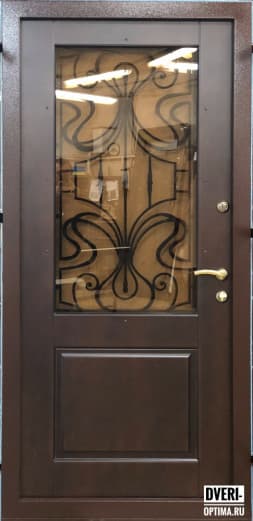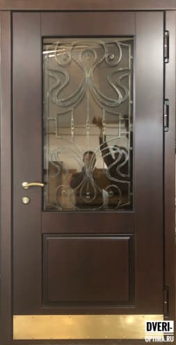 Кованая декоративная решётка придаёт двери эстетичный вид и служит дополнительным элементом защиты остеклённой части.