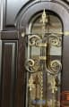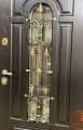 Декоративные элементы в виде художественной ковки и стеклянной вставки придают двери выразительный внешний вид, а фрамуга визуально увеличивает высоту входной группы и пропускает больше естественного света.