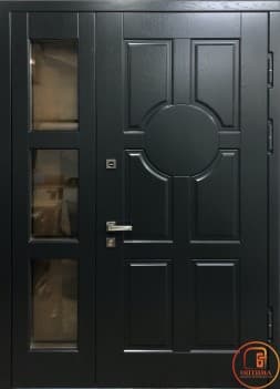 | Комплектация | Отделка внешняя: МДФ 10 мм "Шпон дуба". Фальшь филенка. Отделка внутренняя: МДФ 10 мм. "Шпон дуба" Фальшь филенка. Контурное уплотнение дверного полотна и дверного блока резиновыми уплотнителями. Заполнение дверного полотна теплоизоляционным материалом. Дверной блок и торцы дверного полотна окрашены порошковым напылением. Усиленные противосъемные блокираторы. Боковая вставка оснащена двухкамерными стеклопакетами с легкой бронзовой тонировкой. Изготовление двери по индивидуальным размерам |