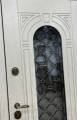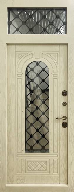 Уличная термодверь с остекленной фрамугой и ковкой.