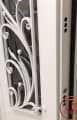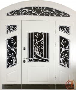 Боковые вставки и фрамуга оснащены двухкамерными стеклопакетами с зеркальной тонировкой и декоративными коваными решетками.