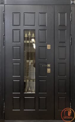 | Комплектация | - Отделка внешняя: МДФ влагостойкий толщиной 10 мм с натуральным шпоном. - Отделка внутренняя: МДФ влагостойкий толщиной 10 мм с натуральным шпоном. - Полностью утепленное полотно и рама. - Три контура уплотнения. - Дверной блок и торцы дверного полотна окрашены порошковым напылением "Муар 8019". - Ночная задвижка Crit. - Усиленные противосъемные блокираторы. - Пассивная створка фиксируется торцевым упором А-505. - Трехкамерный стеклопакет. - Кованная решетка внутри стеклопакета. - Изготовление двери по индивидуальным размерам |