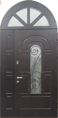 Двустворчатая арочная дверь с отделкой МДФ, стеклом и ковкой