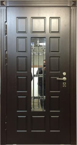 Специальная форма панели МДФ придаёт классический шарм парадной двери, украшенной коваными элементами. Стеклянное окно, скрывающееся за кованым узором, открывает дорогу солнечным лучам и позволяет видеть приближающегося гостя. Безукоризненная работа петель, надёжное уплотнение проёма, а также полноценный комплект из цилиндрового и сувальдного замков обеспечивают комфорт и безопасность хозяев здания.