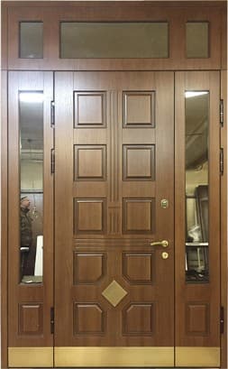 Двустворчатая парадная дверь с остекленной фрамугой и боковой вставкой.