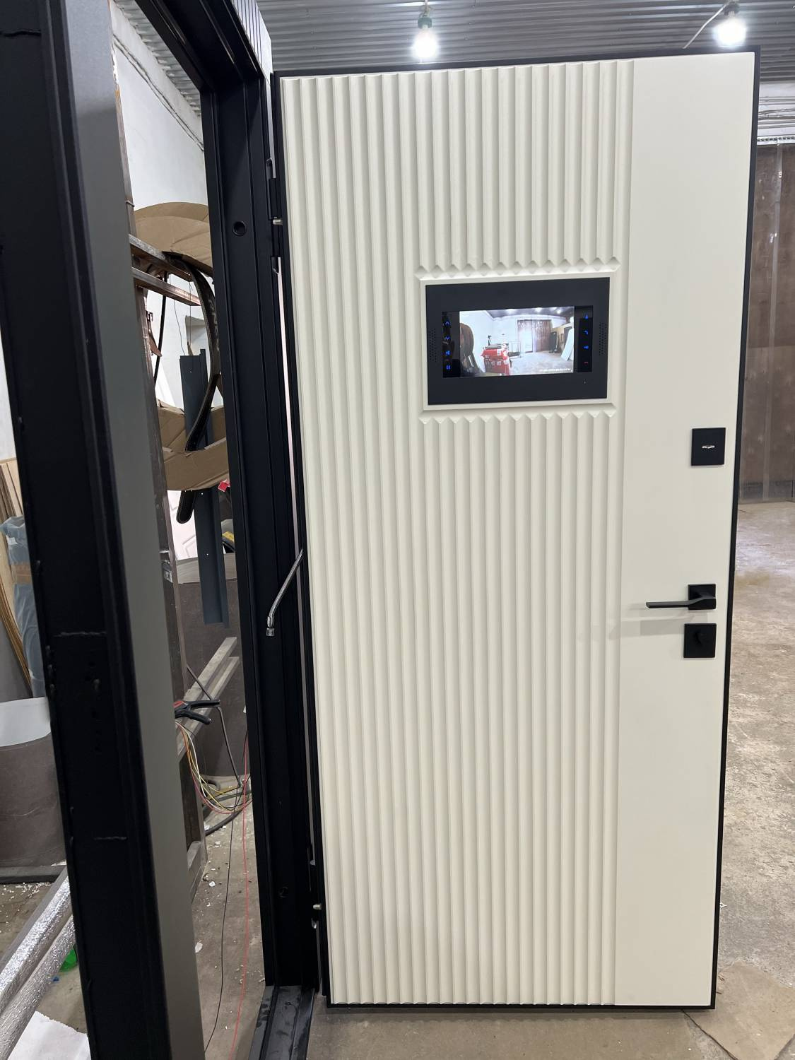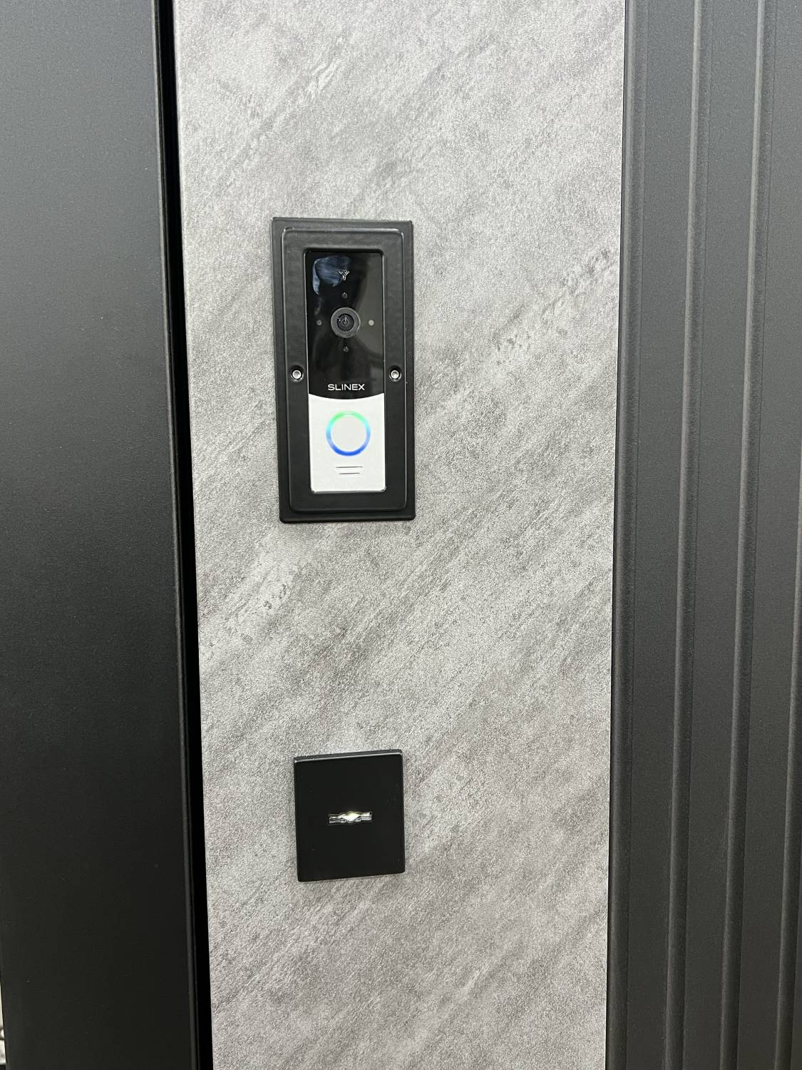 | Комплектация | - Отделка внешняя: двух составная панель МДФ в современном дизайне с покрытием пленкой ПВХ. - Отделка внутренняя: панель МДФ с фрезеровкой. Покрытие пленка ПВХ "Крем ZB 851-2" . - Два контура уплотнения которые обеспечивают герметичное прилегание дверного полотна к раме. - Заполнение дверного полотна минеральной плитой. - Дверной блок и торцы дверного полотна окрашены порошковым напылением "Муар 9005". - С внешней стороны дверного полотна установлена вызывая панель с видеокамерой в HD качестве Slinex ML-20HD. - С внутренней стороны в панель МДФ интегрирован цветной монитор видеодомофон Slinex SL-10N Cloud с возможностью вести запись на карту памяти по датчику движения. При звонке вы так же получите уведомление на свой мобильный телефон и видеокартинку с видеокамеры. С монитором Slinex SL-10N Cloud можно ознакомиться тут - Изготовление двери по индивидуальным размерам. * Данную модель двери возможно укомплектовать наиболее дешевым аналогом виодеодомофоном компании Falcon |