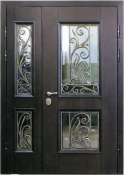 | Комплектация | Тип двери- двустворчатая (вторая створка фиксируется на торцевых фиксаторах.). Контурное уплотнение дверного полотна и дверного блока. Заполнение дверного полотна изоляционным материалом. Усиленные противосъемные блокираторы. Четыре стеклопакета с декоративными решетками. Дверной блок и торцы дверного полотна окрашены порошковым напылением (медный антик). Изготовление по индивидуальным размерам. |