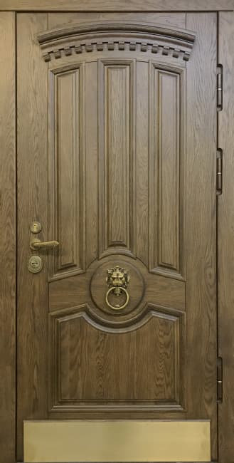 | Комплектация | Контурное уплотнение дверного полотна и дверного блока. Заполнение дверного полотна изоляционным материалом. Усиленные противосъемные блокираторы. Дверной блок и торцы дверного полотна окрашены порошковым напылением (медный антик). Кнокер "Лев" Изготовление по индивидуальным размерам. |