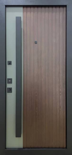 | Комплектация | - Отделка внешняя: панель МДФ с глубокой фрезеровкой. Покрытие - итальянская эмаль по палитре RAL 7016 - Отделка внутренняя: комбинированная панель МДФ с натуральным шпоном дуба, вертикальной фрезеровкой и покрытием итальянской эмалью RAL 7016 в замковой зоне. - Комбинированная система ручек. Вертикальная ручка с электронной системой Intouch для удобного открывания двери. - Три контура уплотнения немецким резиновым уплотнителем Schlegel который обеспечивает герметичное прилегание дверного полотна к раме. - Заполнение дверного полотна звукоизоляционной минеральной плитой. - Дверной блок и торцы дверного полотна окрашены порошковым напылением "Муар 9005". - Ночная задвижка. - Усиленные противосъемные блокираторы. - Изготовление двери по индивидуальным размерам. |