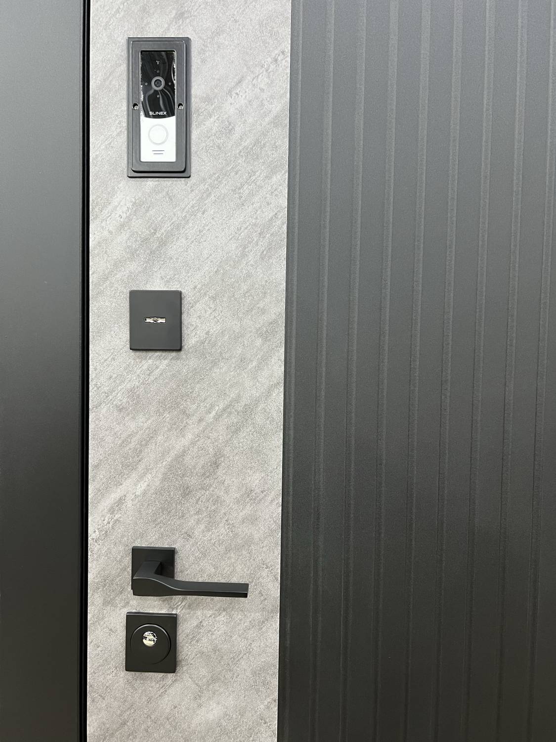 | Комплектация | - Отделка внешняя: двух составная панель МДФ в современном дизайне с покрытием пленкой ПВХ. - Отделка внутренняя: панель МДФ с фрезеровкой. Покрытие пленка ПВХ "Крем ZB 851-2" . - Два контура уплотнения которые обеспечивают герметичное прилегание дверного полотна к раме. - Заполнение дверного полотна минеральной плитой. - Дверной блок и торцы дверного полотна окрашены порошковым напылением "Муар 9005". - С внешней стороны дверного полотна установлена вызывая панель с видеокамерой в HD качестве Slinex ML-20HD. - С внутренней стороны в панель МДФ интегрирован цветной монитор видеодомофон Slinex SL-10N Cloud с возможностью вести запись на карту памяти по датчику движения. При звонке вы так же получите уведомление на свой мобильный телефон и видеокартинку с видеокамеры. С монитором Slinex SL-10N Cloud можно ознакомиться тут - Изготовление двери по индивидуальным размерам. * Данную модель двери возможно укомплектовать наиболее дешевым аналогом виодеодомофоном компании Falcon |