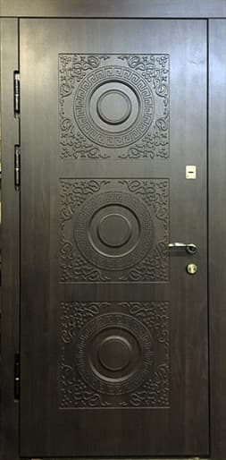 | Комплектация | Антивандальная отделка ПВХ экошпон с резным рисунком. Контурное уплотнение дверного полотна и дверного блока. Заполнение дверного полотна теплоизоляционным материалом. Усиленные противосъемные блокираторы. Дверной блок и торцы дверного полотна окрашены порошковым напылением (медный антик). Изготовление по индивидуальным размерам. |