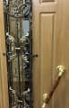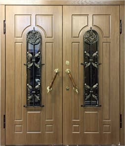 | Комплектация | Тип двери- двустворчатая (вторая створка фиксируется на торцевых фиксаторах.). Контурное уплотнение дверного полотна и дверного блока. Заполнение дверного полотна изоляционным материалом. Усиленные противосъемные блокираторы. Два стеклопакета с декоративными решетками. Дверной блок и торцы дверного полотна окрашены порошковым напылением (медный антик). Изготовление по индивидуальным размерам. |