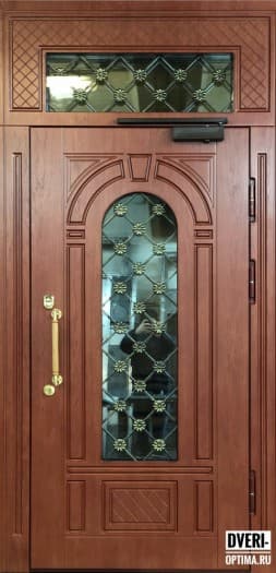 Парадная дверь со стеклопакетами и кованными решетками внутри.