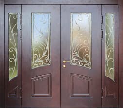 Внешняя отделка шпонированный МДФ со стеклопакетами и коваными изделиями. Идеальная дверь для тех, кому важна роскошь во всем. Шпонированный МДФ в качестве отделки подчеркнет Ваш статус.