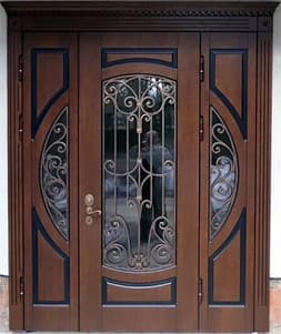 | Комплектация | Контурное уплотнение дверного полотна и дверного блока. Заполнение дверного полотна и боковых вставок теплоизоляционным материалом. Дверной блок и торцы дверного полотна окрашены порошковым напылением (медный антик). Прозрачные двухкамерные стеклопакеты с декоративными коваными решетками. Усиленные противосъемные блокираторы. Изготовление по индивидуальным размерам. |