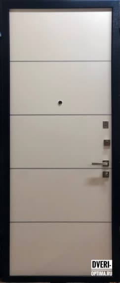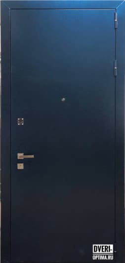 Внешняя отделка с порошковым полимерным напылением "Антик синий". Внутренняя декоративная МДФ панель белого цвета с алюминиевыми молдингами. Замковая система состоит из двух раздельных замков фирмы Гардиан (Россия) которая соответствует цене и качеству. Толщина дверной коробки 85 мм., а толщина дверного полотна равна 63 мм. В полость дверного полотна плотно уложена шумоизолирующая минеральная плита Rockwool Акустик Баттс.