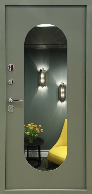 Входная дверь в квартиру в дизайнерском стиле с овальным зеркалом внутри.