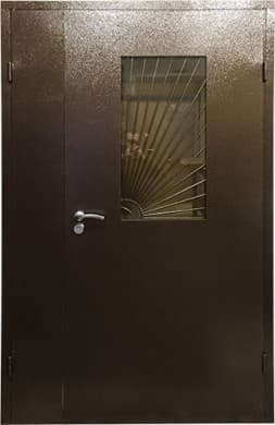 | Комплектация | Фиксаторы второй створки для открывания/закрывания . Усиленные противосъемные блокираторы дверного полотна. Прозрачный стеклопакет с защитной решеткой из стального прутка d-10 мм. Изготовление двери по индивидуальным размерам. |