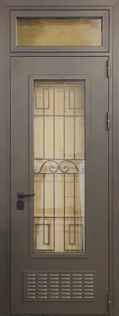 | Комплектация | - Контурное уплотнение дверного полотна и дверного блока резиновыми уплотнителями для герметичного и плотного прилегание полотна к раме. - Заполнение дверного полотна теплоизоляционной минеральной плитой. - Противосъемные блокираторы - Регулируемая вент. решетка размером 250х600 мм. - Дверное полотно оснащено прозрачным стеклопакетом с защитной стальной решеткой внутри из стального квадрата 10х10 мм. - Дверной блок с монолитной остекленной фрамугой с трехкамерным стеклопакетом. |