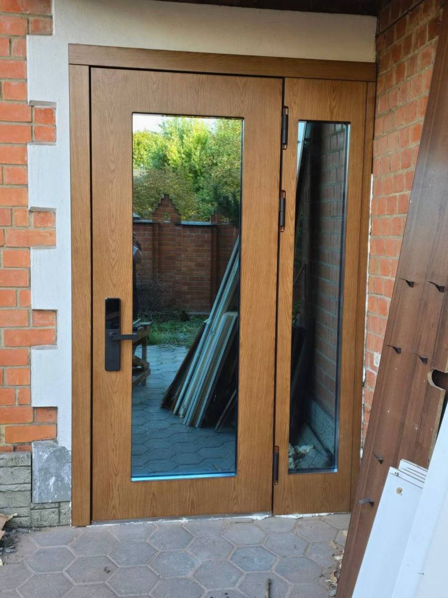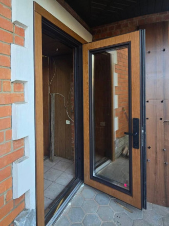 Простое и лаконичное решение в оттенке натурального дерева. Полное остекление с зеркальной тонировкой.