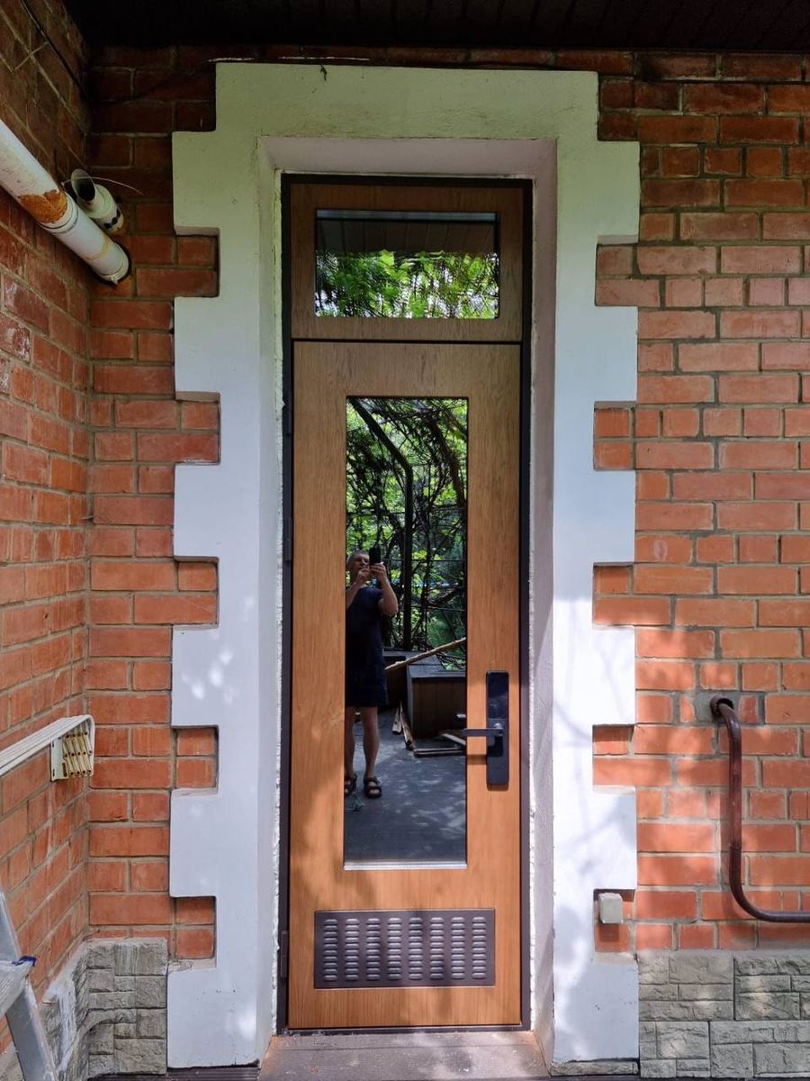 Экстерьер Важен!: Отделка двери — декоративные панели МДФ с натуральным шпоном дуба. Тёплый оттенок и благородная текстура дуба идеально вписались в общий стиль дома. Дверь в котельную не «кричит» о своём утилитарном назначении, а выглядит как органичная часть фасада.