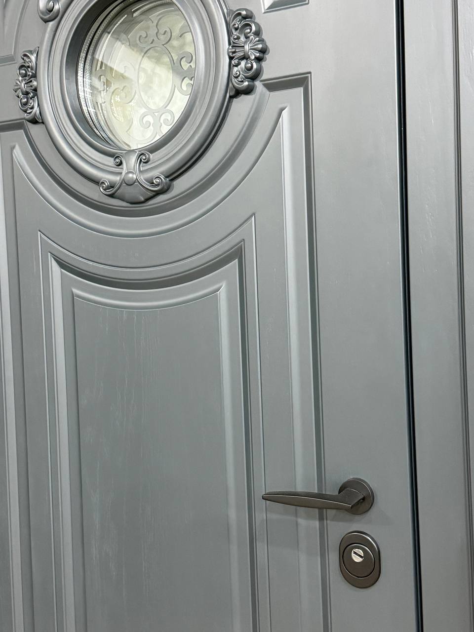 - Детали: Верхнюю часть полотна украшает круглый стеклопакет с ажурной стальной решеткой.