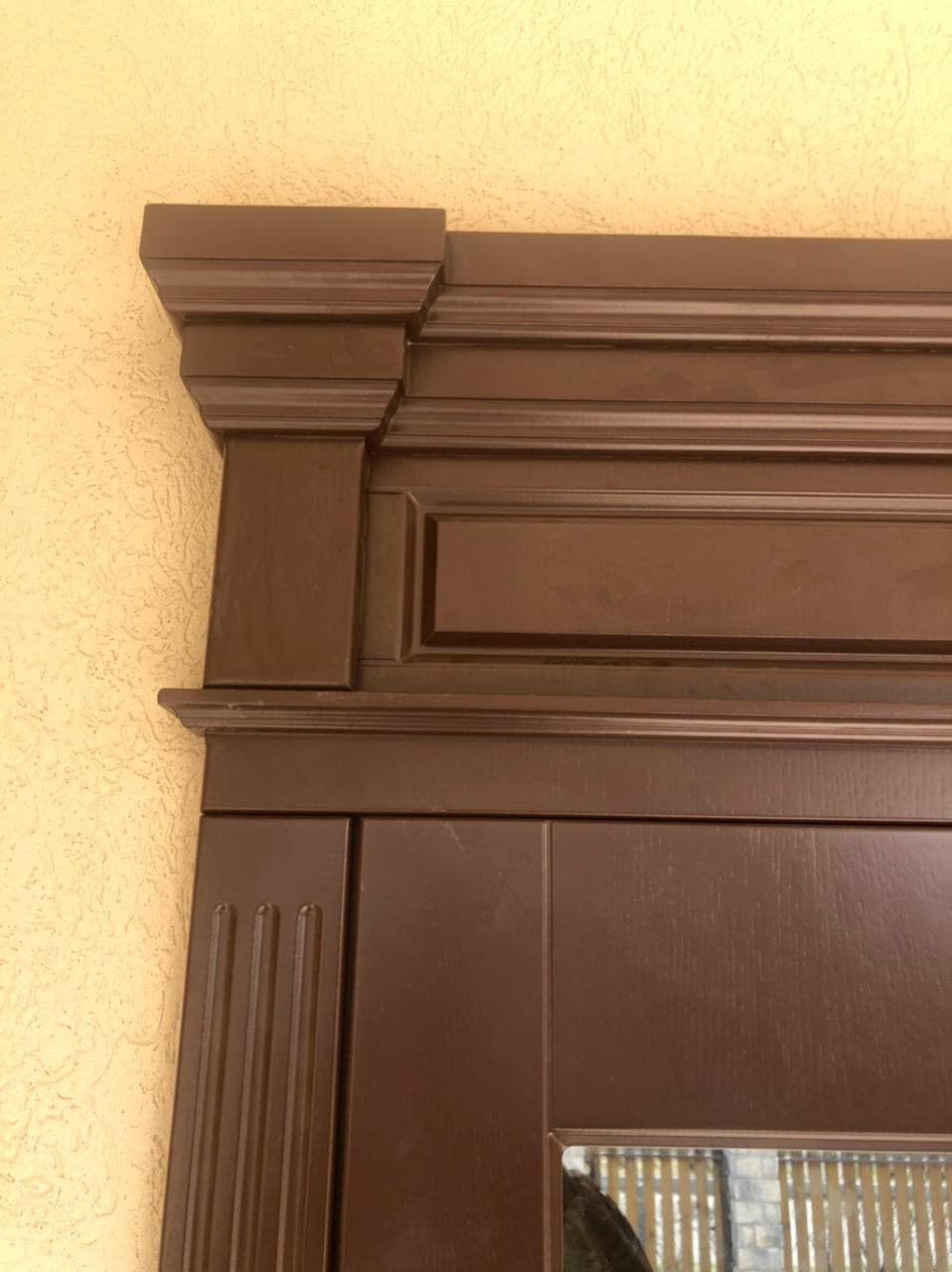 Компания “Двери Оптима” установила входную парадную группу со стеклом коричневого цвета модели C-70. Внешняя и внутренняя отделка выполнены влагостойкого МДФ с натуральным шпоном толщиной 10 мм. Окрас панелей произведен по каталогу RAL. Дверное полотно и дверной блок имеют контурное уплотнение и заполнены теплоизоляционным материалом. Дверной блок и торцы дверного полотна имеют порошковое напыление. Установлены усиленные противосъемные блокираторы, а боковые вставки оснащены двухкамерными стеклопакетами с легкой тонировкой. В качестве дверной фурнитуры используются нокер “Кольцо” и латунный отбойник дверного полотна.