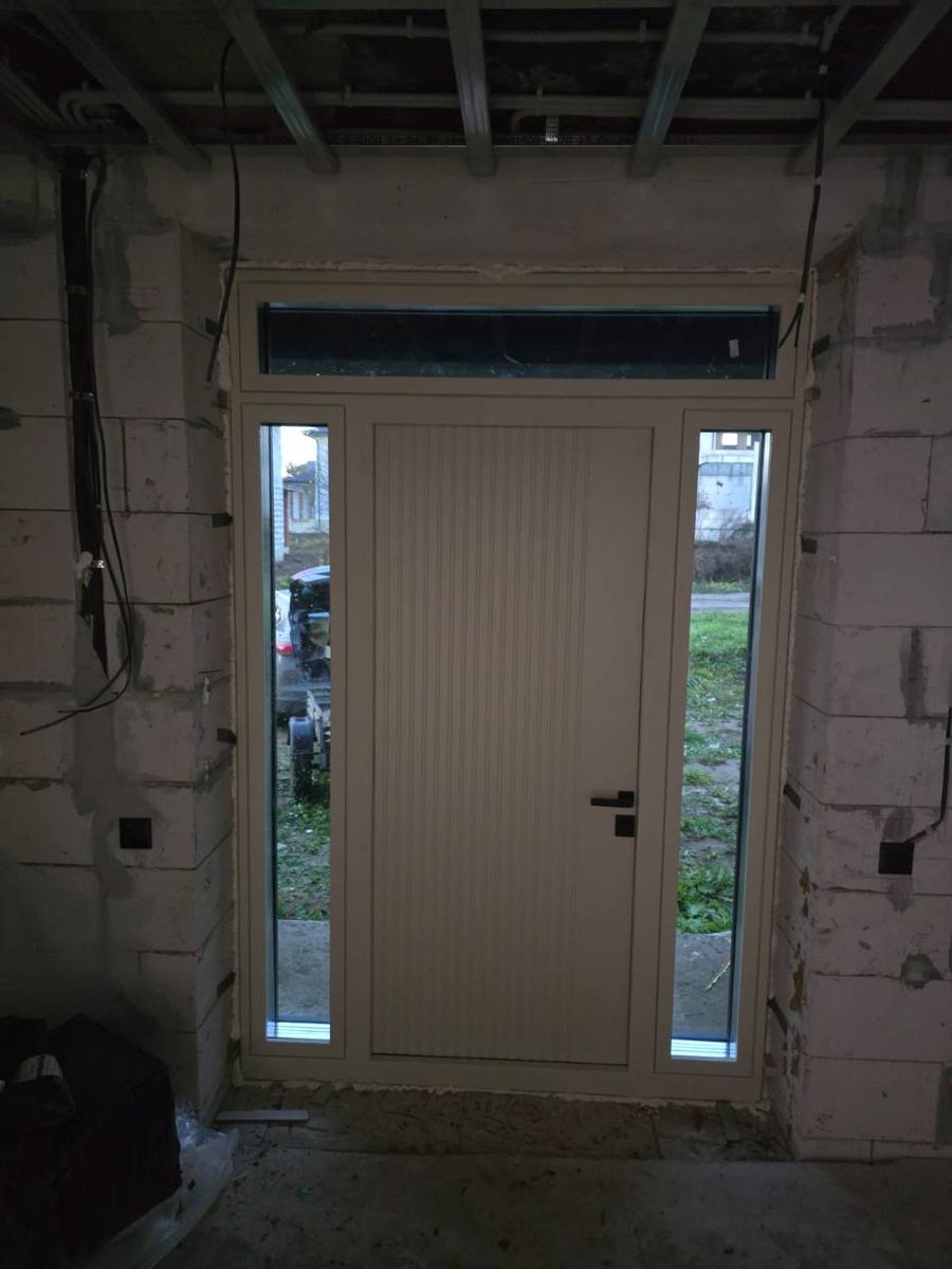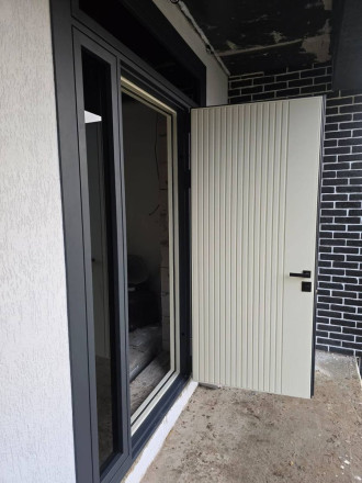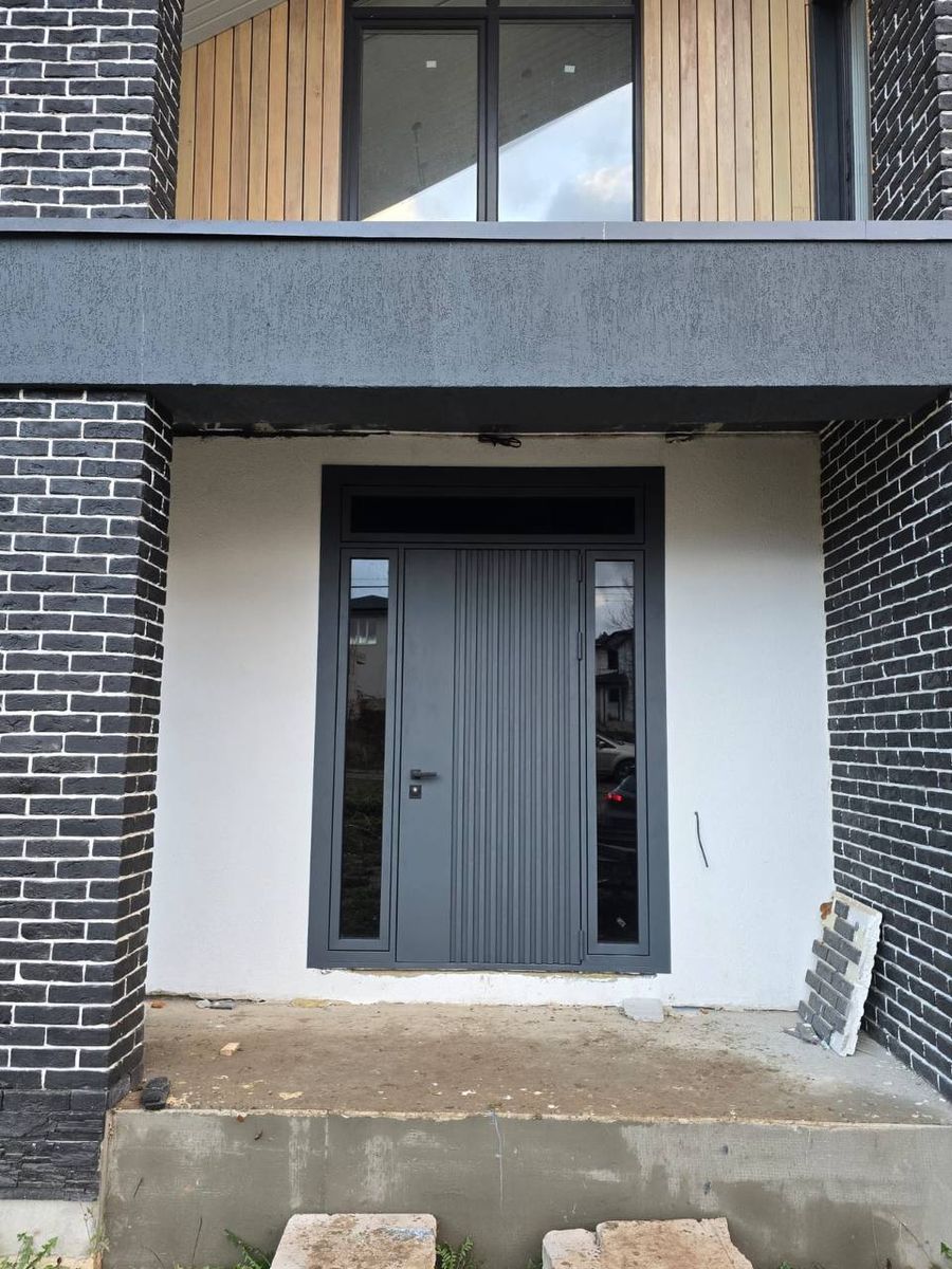 Реализованный проект входной группы ТР-121 с металлическими рейками на полотне — портфолио