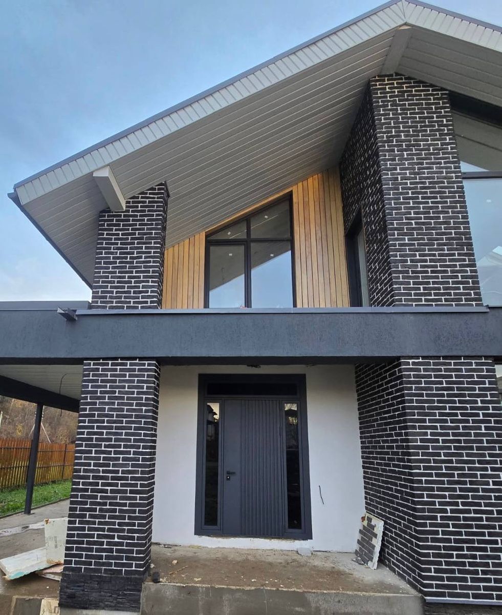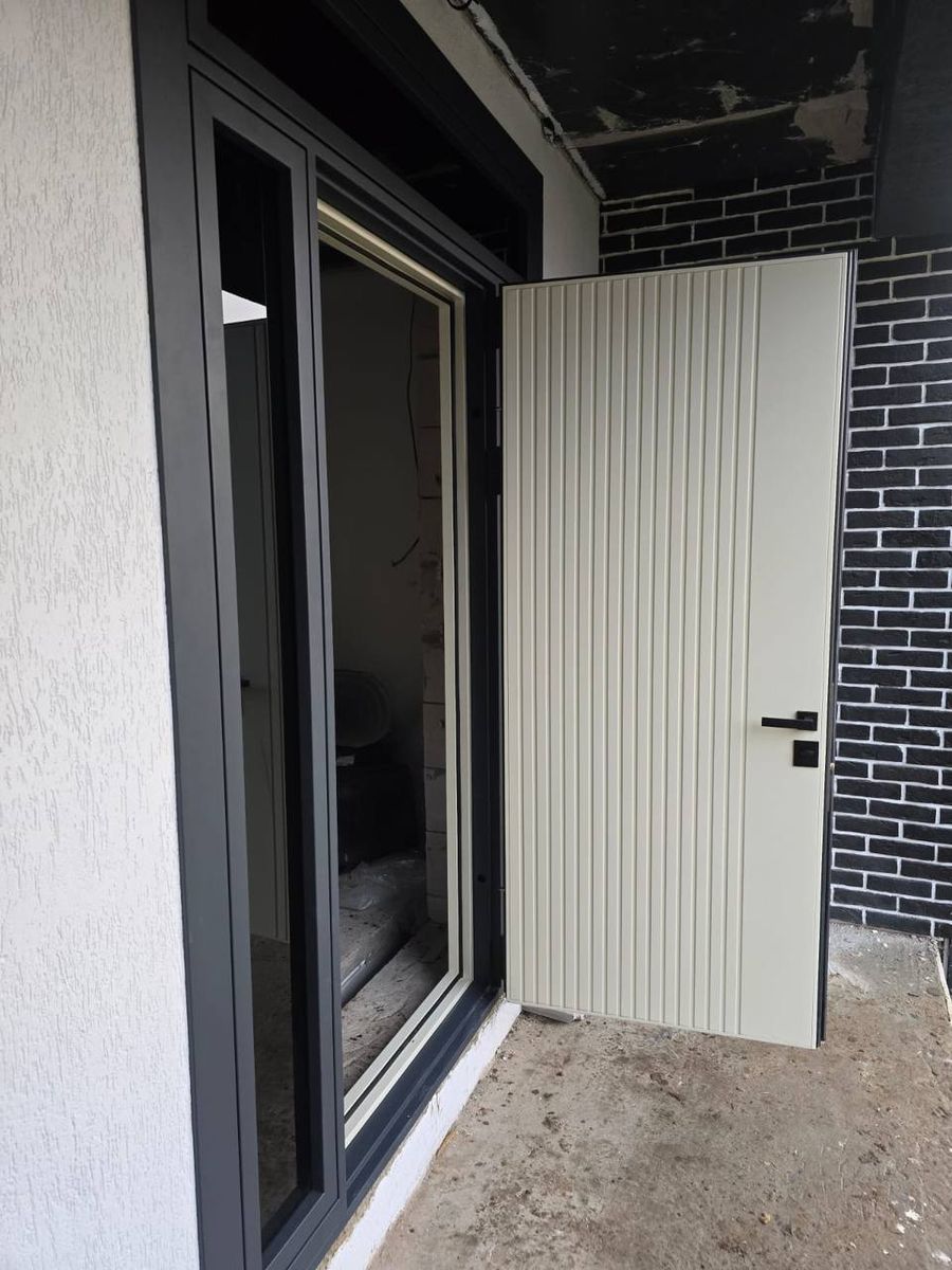 - Внешнее покрытие: порошковое напыление «муар» (7016) + цинкование всей металлоконструкции. Декор: металлические рейки на полотне.