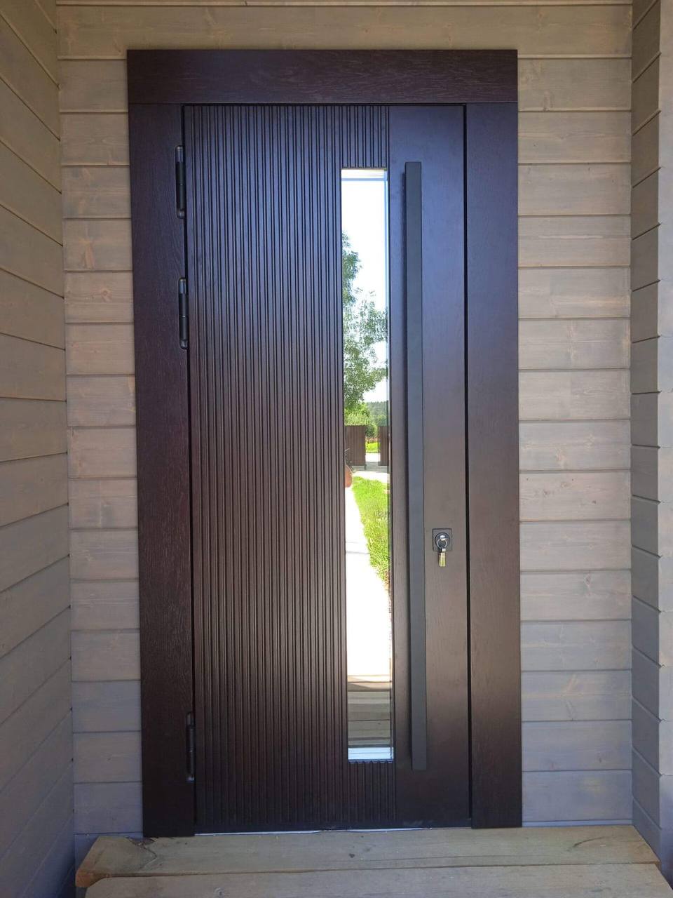 Термодверь с отделкой шпоном дуба и вертикальной ручкой