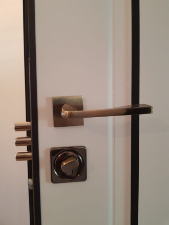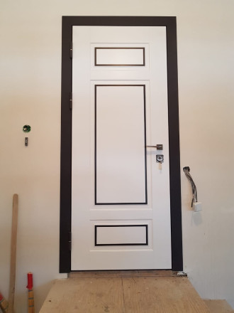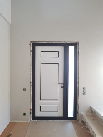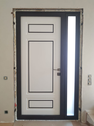 Дверь ТР-105 изготовлена с использованием МДФ в белой эмали и имеет матовое стекло. Она обладает высокой теплоизоляцией благодаря наличию терморазрыва. Дверь произведена и установлена профессионалами компании Оптима.