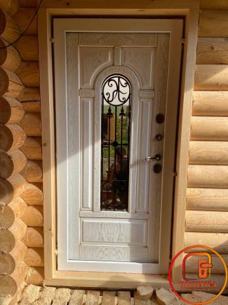 Внешняя и внутренняя отделка двери выполнена из прочного и долговечного МДФ (шпона), что обеспечивает высокую устойчивость к внешним воздействиям и длительный срок службы. Кованая металлическая решетка добавляет двери элегантности и защищает ее от взлома.