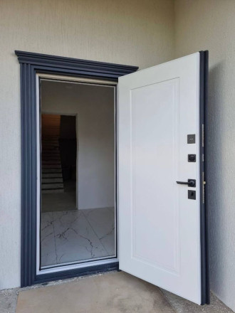 Входная дверь с металлическими филенками и карнизом– фото проекта