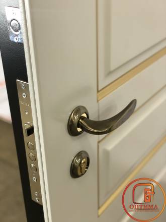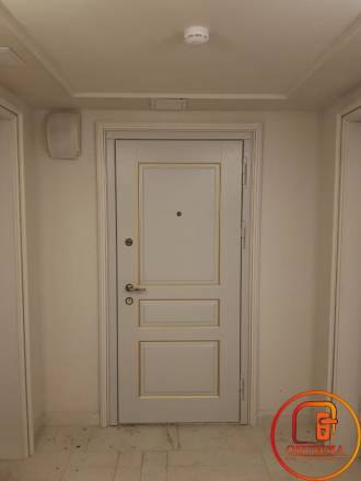 - Внешняя отделка двери с декоративной накладкой МДФ с широкой фрезеровкой и выделенной окантовкой золотой патиной.