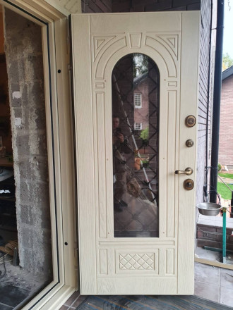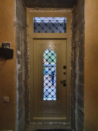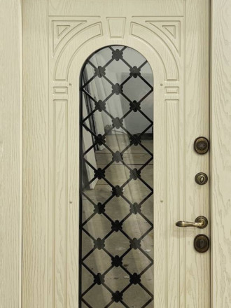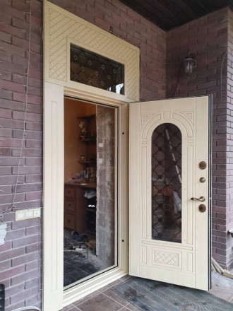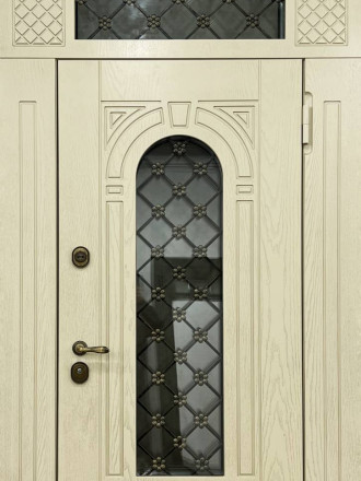Компания «Двери Оптима» установила входную термодверь с фрамугой и ковкой, модель ТР-69, предназначенную для использования на улице. Отделка двери выполнена панелями МДФ с натуральным шпоном дуба, окрашенными эмалью RAL 1015 с серебристой патиной. Высокая термоизоляция обеспечивается многослойным утеплением дверного полотна и рамы. Три контура уплотнения препятствуют проникновению холода. Оцинкованная металлическая конструкция устойчива к коррозии, окрашена порошковой краской Муар 1015. В дверном полотне и фрамуге установлены трехкамерные стеклопакеты, внутри которых расположена ковка, окрашенная порошковой краской с патиной. Дополнительно установлен латунный декоративный отбойник.
