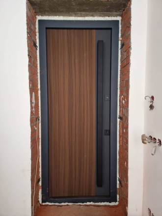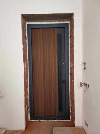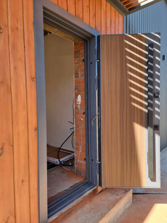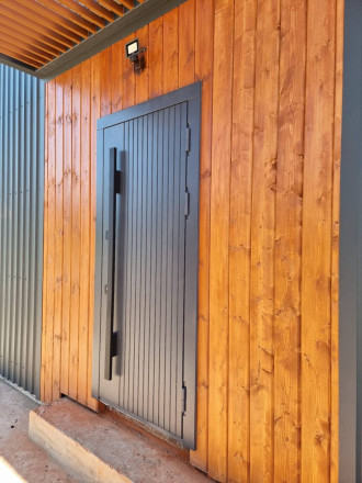 - Входная термодверь с вертикальной фрезеровкой снаружи и комбинированной панелью МДФ внутри.