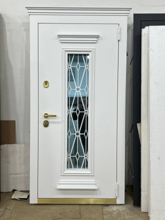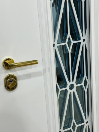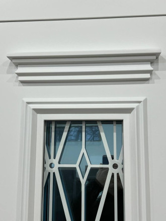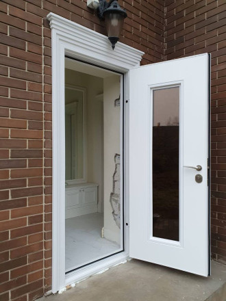 Плавные линии багета, индивидуальный рисунок решётки, всё это делает дверь — уникальным элементом фасада.