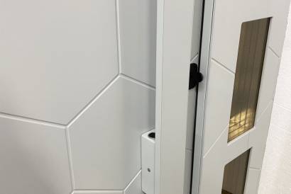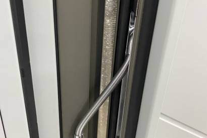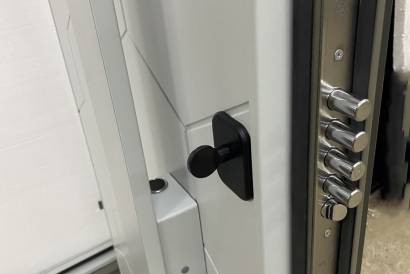 Третий контур уплотнения выполнен по периметру дверной коробки. Использован уплотнитель Schlegel (Германия). Сама коробка с термовставкой 130 мм. Предусмотрены два противосъемных блокиратора. Коробка утепляется фольгированным пенофолом.