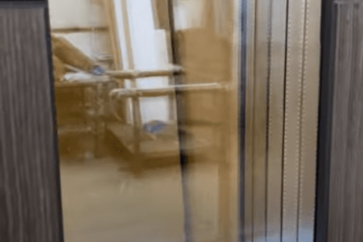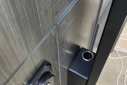 Установлена ручка металлическая «скоба» со вставкой из МДФ. Окрашена порошковым напылением муар, цвет по RAL 9005. В ручку интегрирована кнопка для открывания двери. Высоту и ширину ручки можно менять (на данной модели двери установлена ручка 1400х100 мм).